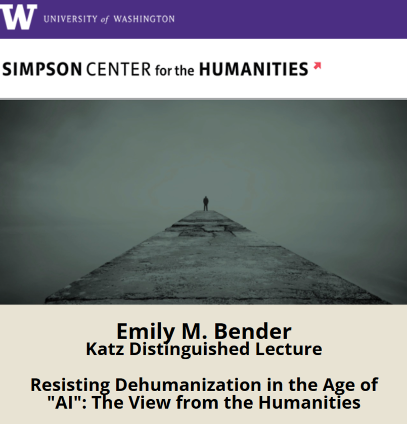 This coming Winter, Professor Emily Bender is set to lecture on "Resisting Dehumanization in the Age of "AI": The View from the Humanities." This talk is a part of a series of Katz Distinguished Lectures in the Humanities. Professor Bender will be discussing data collection, human interpersonal relationships and human-computer interactions, and what is means to be human.